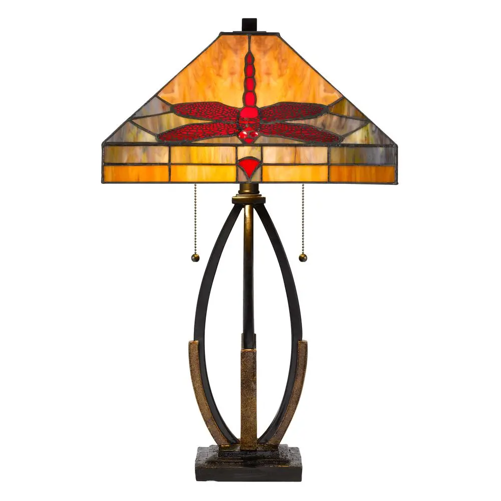 Square tiffany shade Art color glass Dual pull chain switches Dragon Fly design Mission Style Sturdy metal base Intricate base design