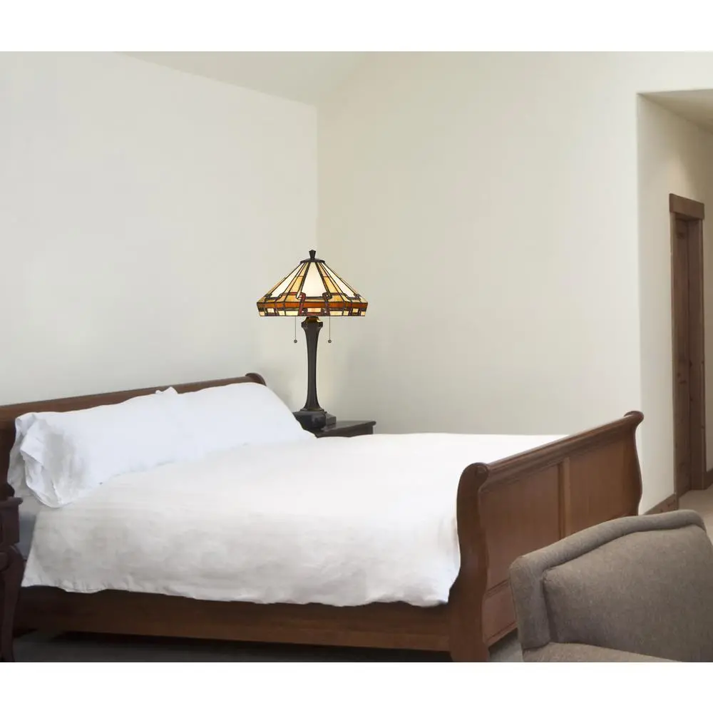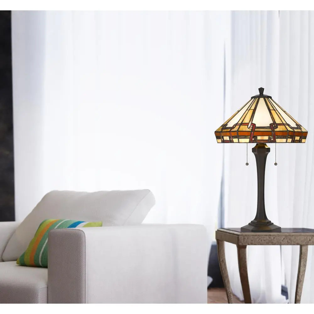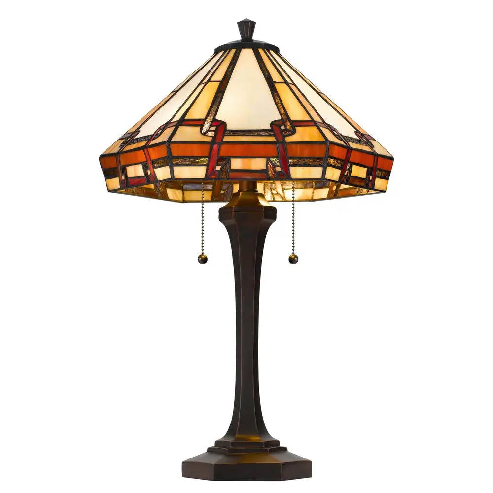 Tiffany shade Art color glass Dual pull chain switches Mission Style Geometric pattern Matching floor lamp Matching finial Heavy weighted base