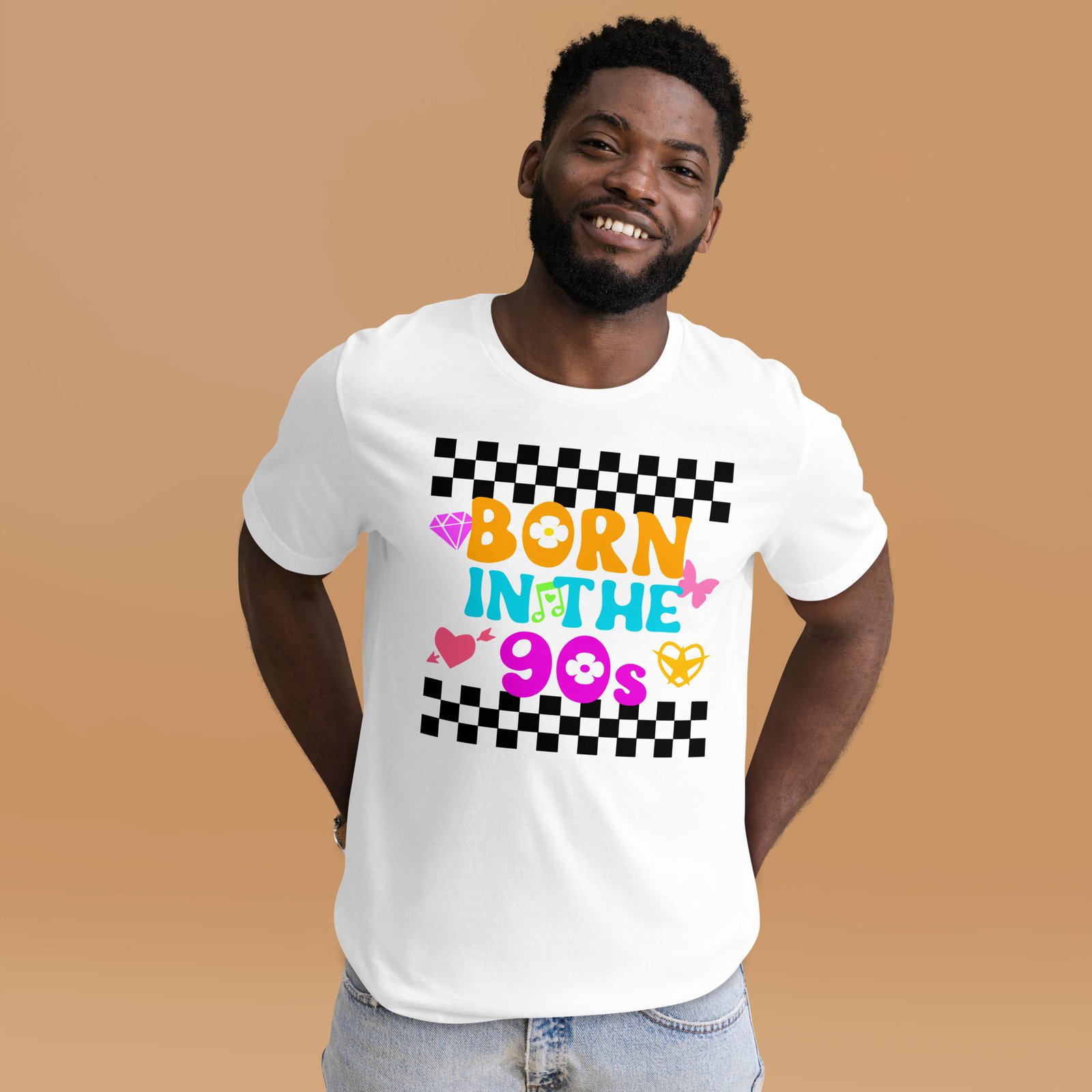 Celebrate your 90’s roots with this fun and colorful “Born in the 90’s” Retro T-Shirt! Featuring bold bubble letters, musical notes, hearts, butterflies, diamonds, and flowers, this playful design is perfect for anyone proud to be a true 90’s baby.