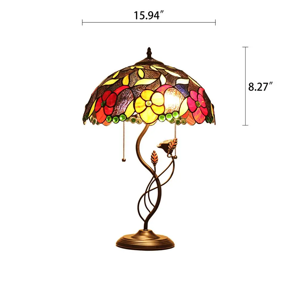 Mariebelle is a gorgeous Floral Style table lamp, featuring a rose base and red and yellow flowers on the shade. The hand crafted Tiffany shade is made up of over 170 pieces of hand cut, stained art glass and 32 glass beads, expertly pieced and soldered together to create each shade. Each of CHLOE’s Tiffany-style stained glass shades are formed using the very same techninique developed by Louis Comfort Tiffany in the early 1900’s, using hand cut stained art glass, each wrapped in fine copper foil and soldered together at extremely high temperatures to form each unique shade. Exact size to the nearest inch may vary, and exact color of each glass piece may vary due to each piece being hand crafted. First image is with the light on, second image is with the light off.