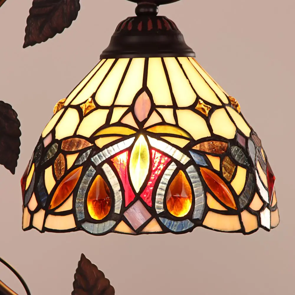Serenity is a stunning 1 light mini table lamp, featuring a beautiful vine base and a victorian shade. This piece would be perfect as a bedside lamp, or an accent lamp in a foyer. Each shade is hand crafted, using the same methods developed by Louis Comfort Tiffany in the early 1900’s. This process entails using 162 hand cut stained art glass pieces and 21 crystals, each wrapped in fine copper foil and soldered together at extremely high temperatures to form each unique piece. Exact size to the nearest inch may vary, and exact color of each glass piece may vary due to each piece being hand crafted. First image is with the light shining through, second image is with no light. Dry listed and recommended for an indoor setting.