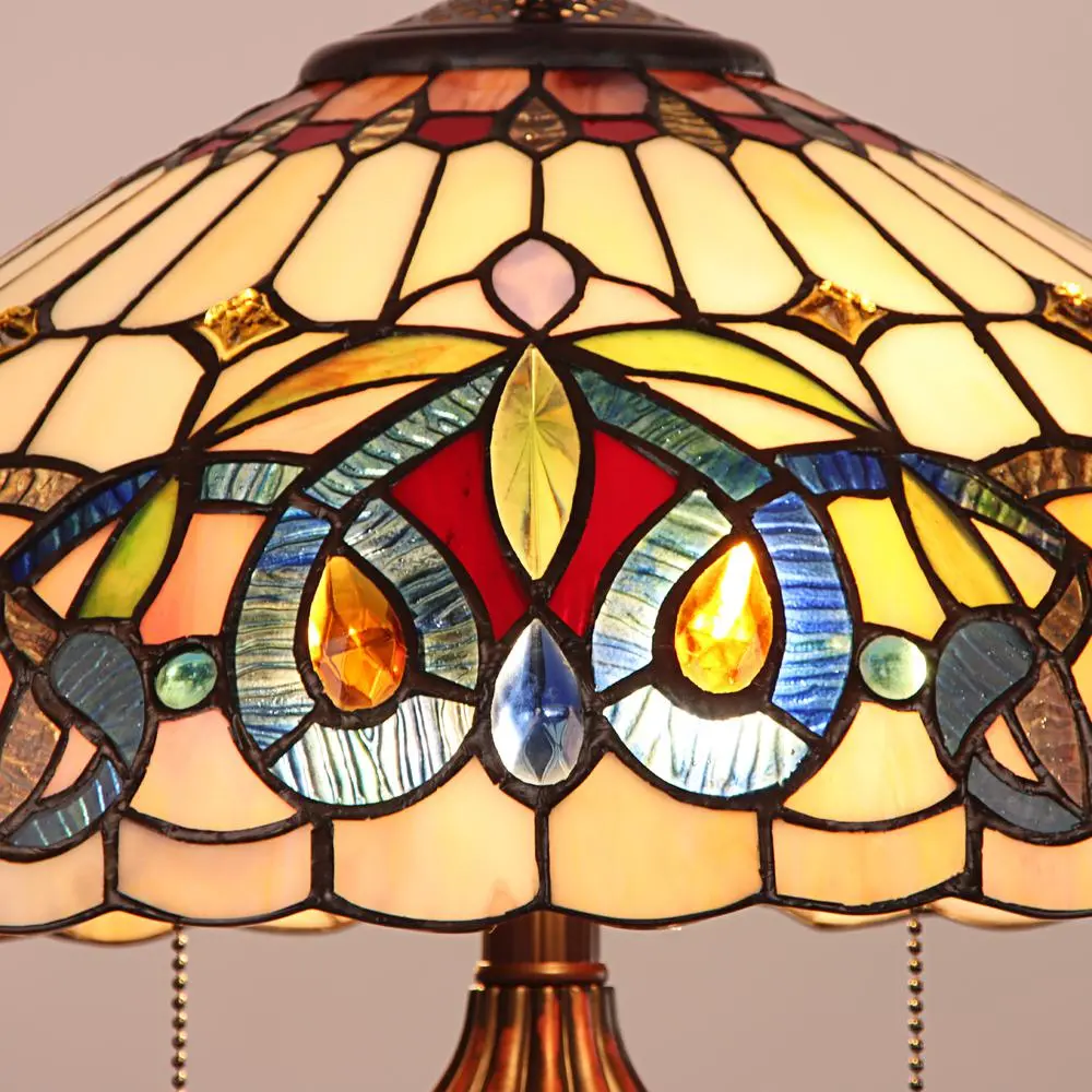 Serenity is a beautiful victorian-style 2 light table lamp featuring warm, colored stained glass. Each shade is hand crafted, using the same methods developed by Louis Comfort Tiffany in the early 1900’s. This process entails using 330 hand cut stained art glass pieces, 6 glass beads and 36 crystals, each wrapped in fine copper foil and soldered together at extremely high temperatures to form each unique piece. Exact size to the nearest inch may vary, and exact color of each glass piece may vary due to each piece being hand crafted. First image is with the light shining through, second image is with no light. Dry listed and recommended for an indoor setting.