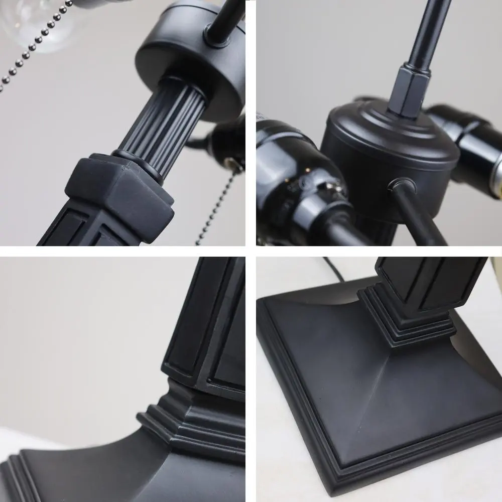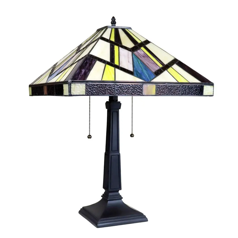 Vincent is a beautiful, stained glass table lamp in a traditional Mission style, featuring a blackish bronze base and 2 pull chains switches. This lamp would be perfect in a bedroom, living room, and dining room. The shade is hand-crafted, using the same methods developed by Louis Comfort Tiffany in the early 1900’s. This process entails using 148 hand cut stained art glass pieces, each wrapped in fine copper foil and soldered together at extremely high temperatures to form each unique piece. Exact size to the nearest inch may vary, and exact color of each glass piece may vary due to each piece being hand crafted. First image is with the light shining through, second image is with no light. Dry listed and recommended for an indoor setting.