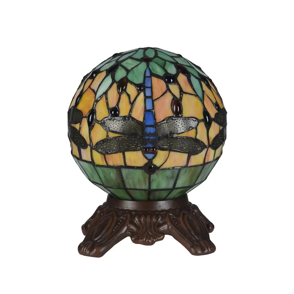 DEMOISELLE, a Dragonfly style 1 light table lamp features a beautiful, globe-like design, that shows off a wonderful green to compliment it’s dragonfly conterpart. Hand crafted from over 210 pieces of art glass and 44 glass beads. Main colors are green and orange. Handcrafted using the same techniques that were developed by Louis Comfort Tiffany in the early 1900s, this beautiful Tiffany-style piece contains hand-cut pieces of stained glass, each wrapped in fine copper foil.