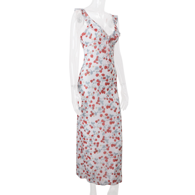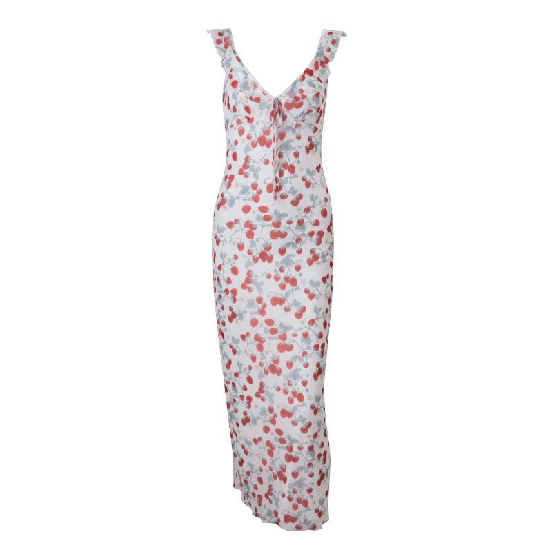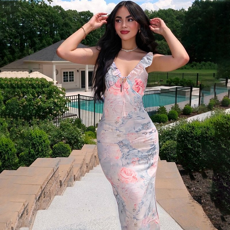 European and American Summer New Women’s Sexy Low-Cut Spicy Girl Vacation Style Retro Print Slim Strapless Dress