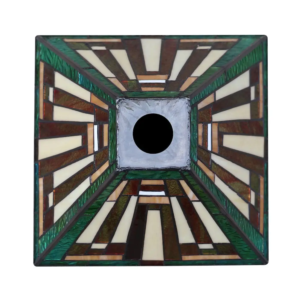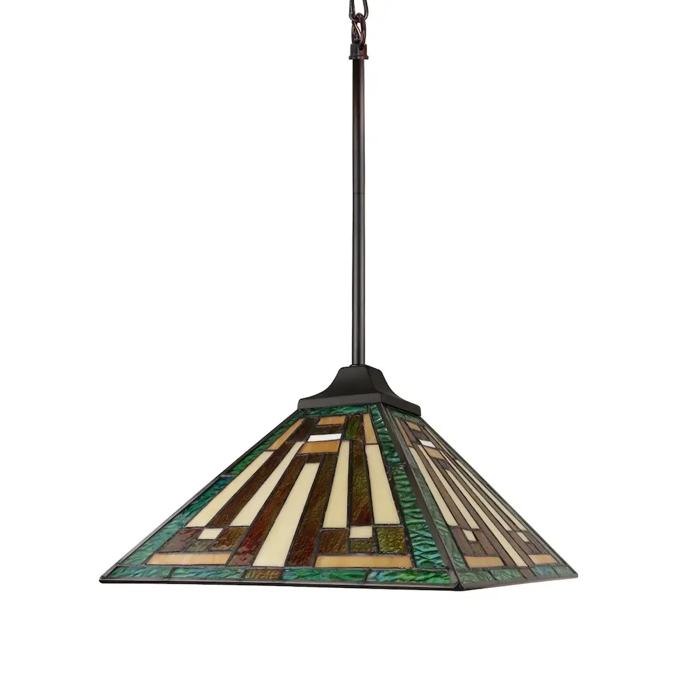 Firman is a stunning 1 light ceiling pendant, featuring a beautiful mission shade. This piece would be perfect in a hallway or even over a bed frame. Each shade is hand crafted, using the same methods developed by Louis Comfort Tiffany in the early 1900’s. This process entails using 152 hand cut stained art glass pieces, each wrapped in fine copper foil and soldered together at extremely high temperatures to form each unique piece. Exact size to the nearest inch may vary, and exact color of each glass piece may vary due to each piece being hand crafted. First image is with the light shining through, second image is with no light. Dry listed and recommended for an indoor setting.
