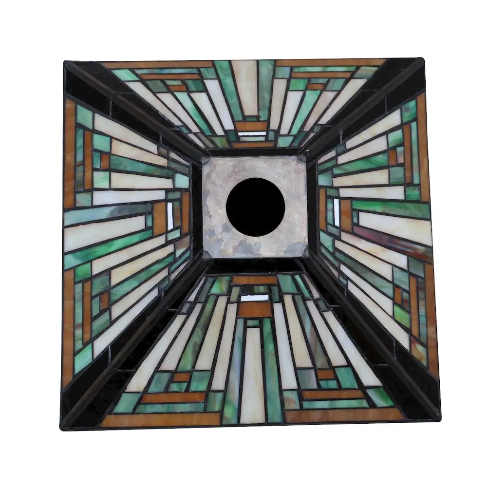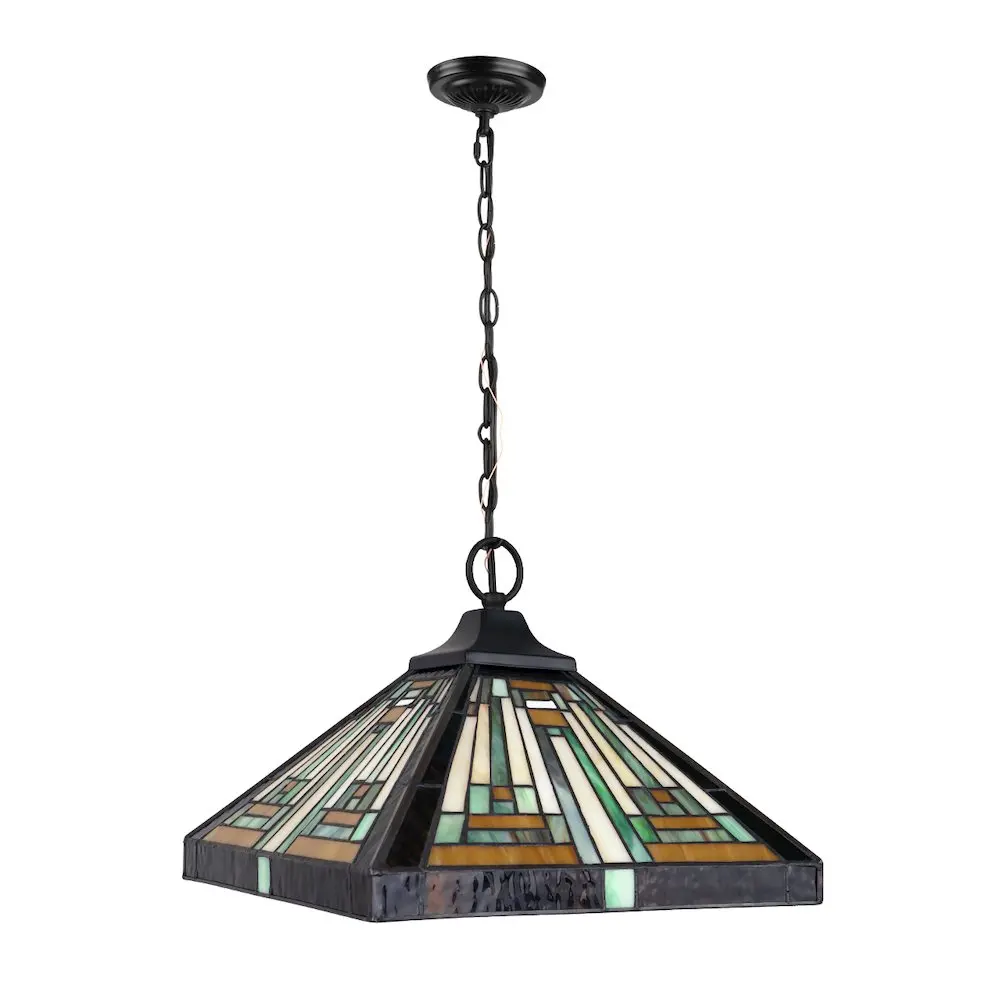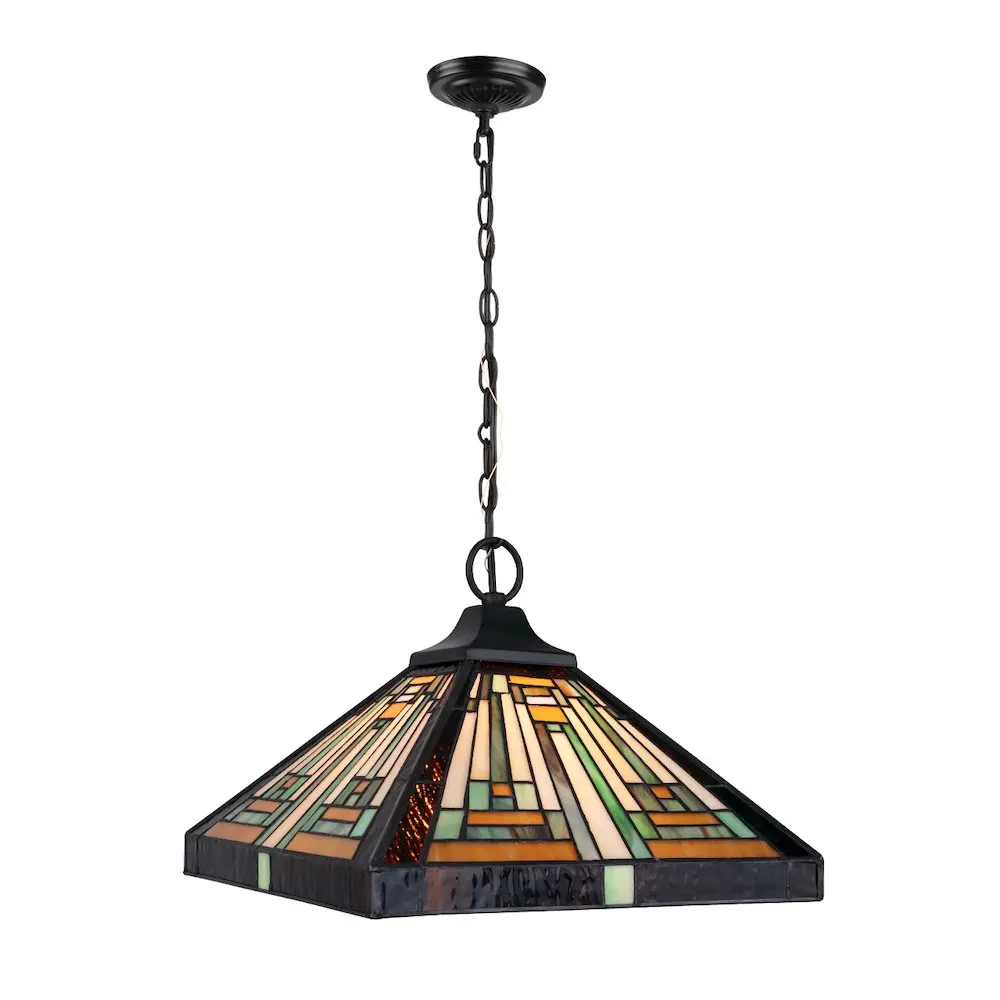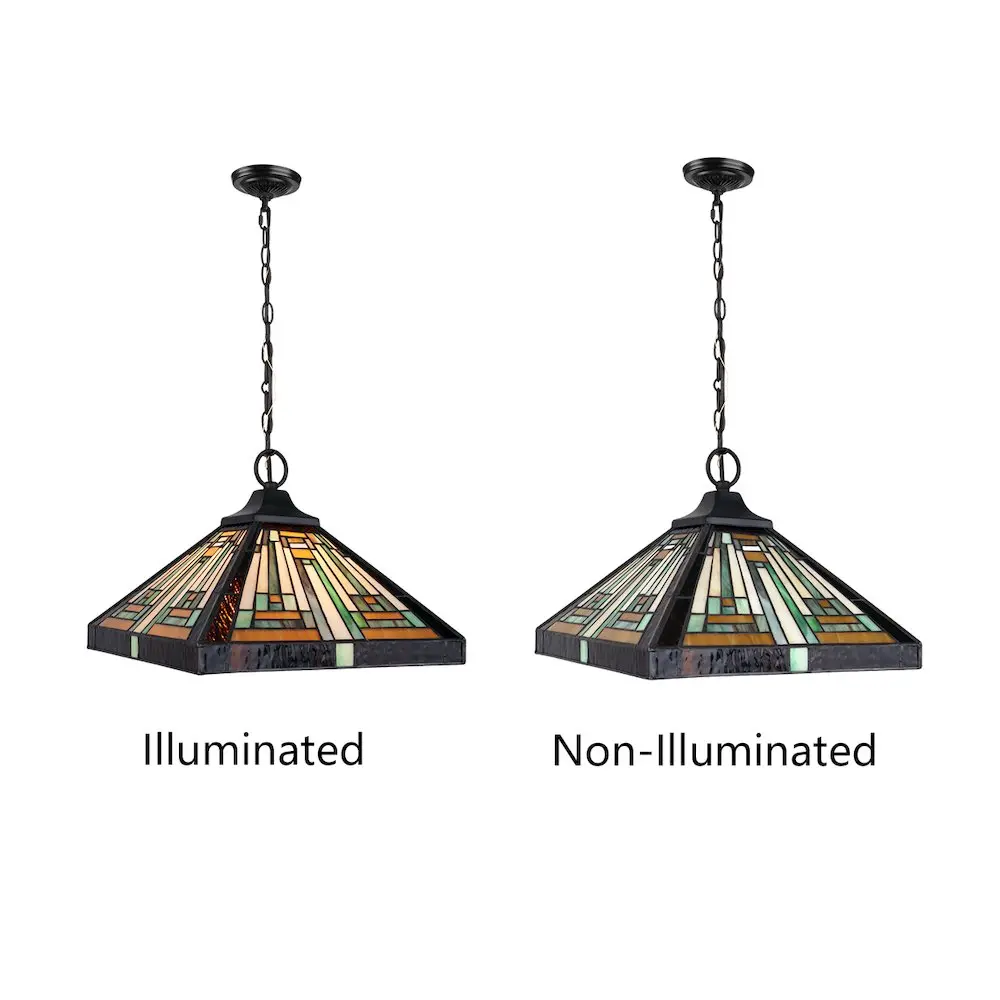 Innes is a stunning 1 light ceiling pendant, featuring a beautiful mission shade. This piece would be perfect in a hallway or even over a bed frame. Each shade is hand crafted, using the same methods developed by Louis Comfort Tiffany in the early 1900’s. This process entails using 232 hand cut stained art glass pieces, each wrapped in fine copper foil and soldered together at extremely high temperatures to form each unique piece. Exact size to the nearest inch may vary, and exact color of each glass piece may vary due to each piece being hand crafted. First image is with the light shining through, second image is with no light. Dry listed and recommended for an indoor setting.