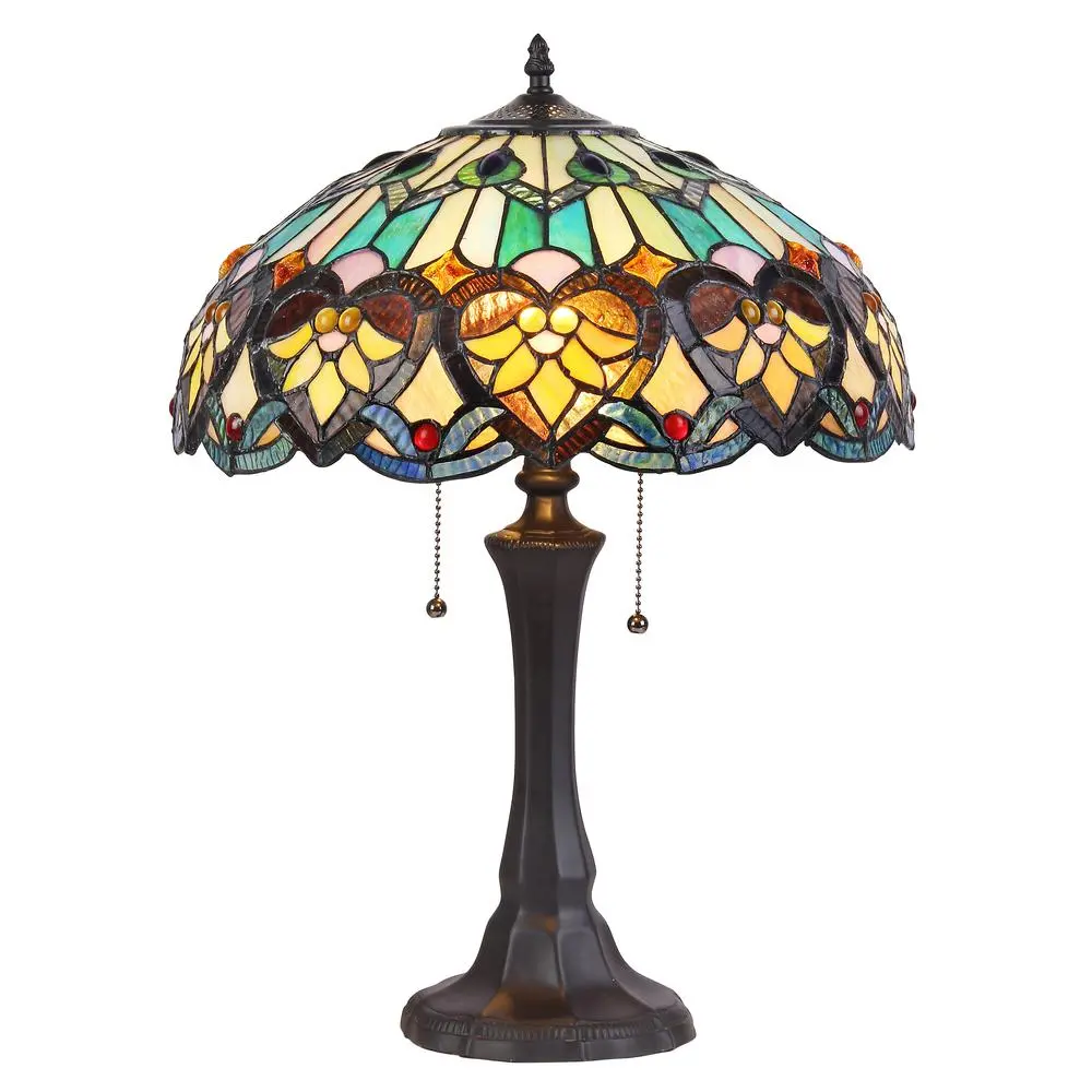 KENDALL, an exquisitely styled Victorian table lamp designed to reflect warmth to any room. Handcrafted with top quality materials the shade is made with intricately cut pieces of real stained glass and designed to enhance any decor. Finished in an antique bronze patina tone, the base design reflects the Victorian era.