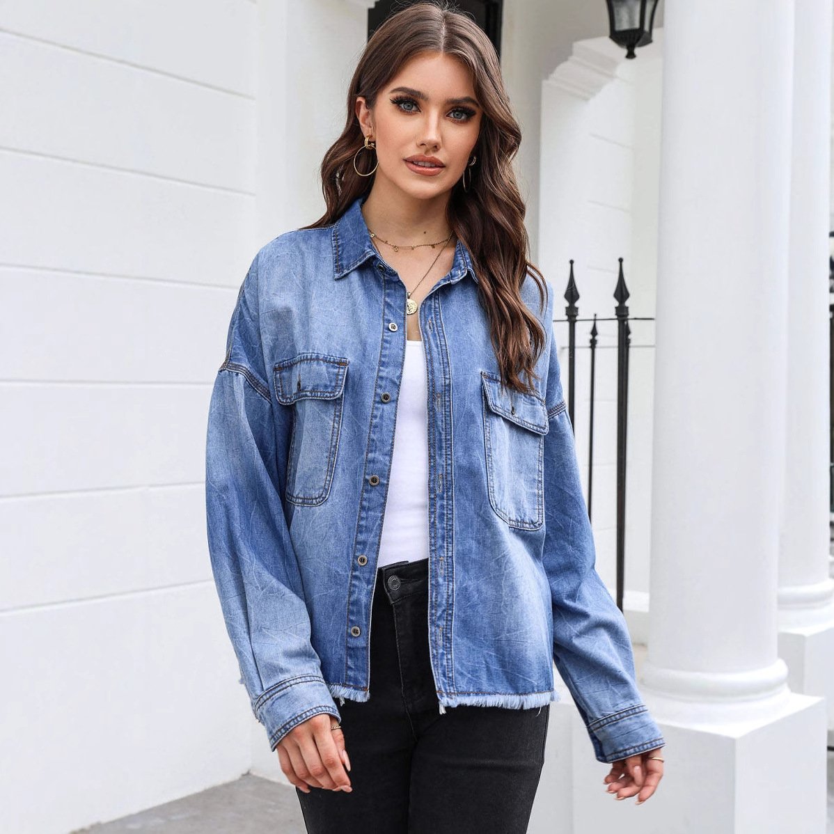 Long sleeved American washed distressed collar vintage denim shirt for women