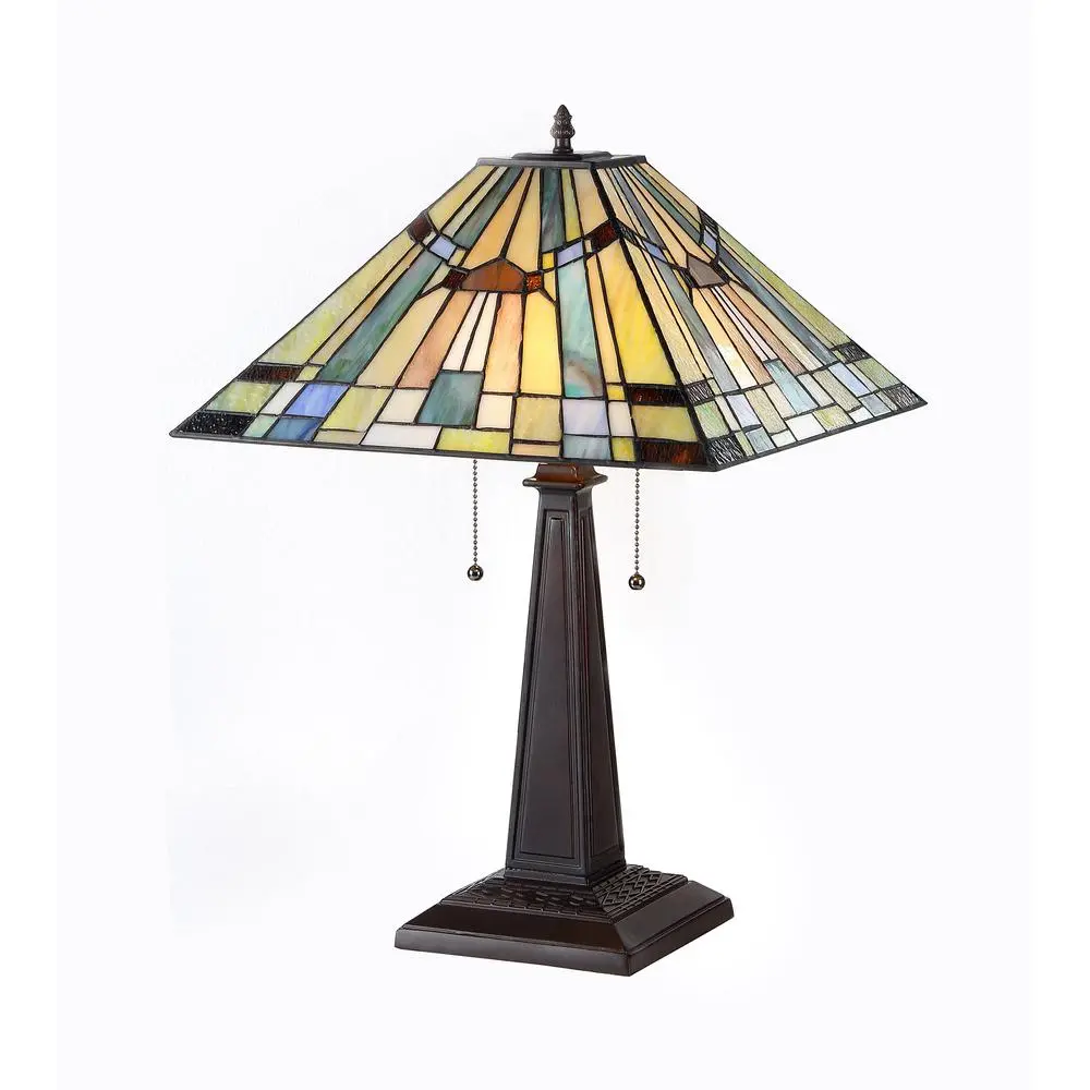 A beautifully hand-crafted table lamp with intricate designed and cut glass lamp shade. Features a mosaic of cut glass each accentuating one another. Soft hues of color exudes from this lamp. Coated in an antique bronze patina tone. Dual chain switch with metallic ball ends. Details abound from the base to the top anchor. Expertly crafted with top quality materials.